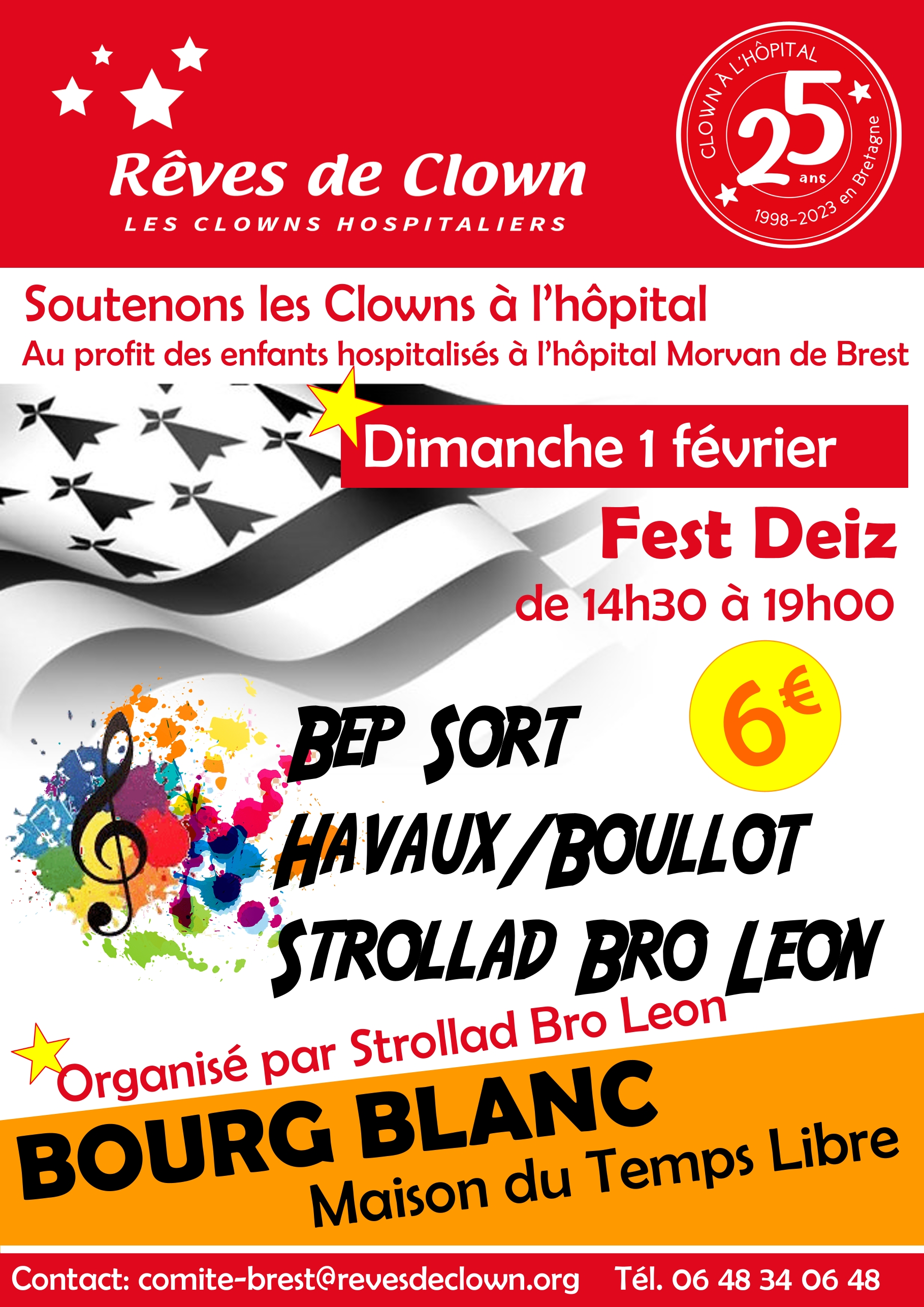 Dim. 29 janv. Fest Deiz au profit de "Rêves de clown" 15h00 sur Bourg Blanc